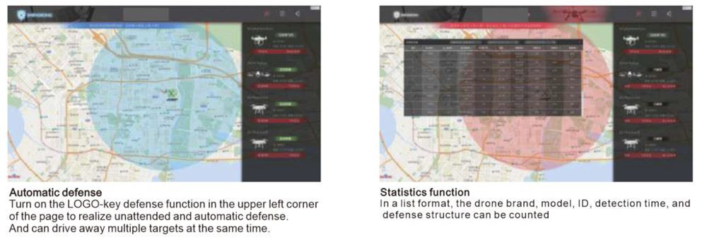 Za vdorne drone lahko izberete: Samodejna obramba z enim-ključnim ključem: ko je aktivirana funkcija obrambe sistema, bo sistem samodejno ščitil dron brez dežurnega osebja; Ročno posredovanje: Ročno lahko izberete obrambo katerega koli drona in način časovne obrambe ali prekinitev obrambe in izberete lahko lokacijo pilota.